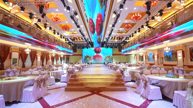 鉑金大廳—色彩濃烈,現代式裝修,面積560㎡,層高6米,開合大屏配合舞美燈光,唯美震撼,可承接30桌的中型宴會;12米長的可移動T臺收起后,就變成了可容納400人同時落座的大型多功能會議室。